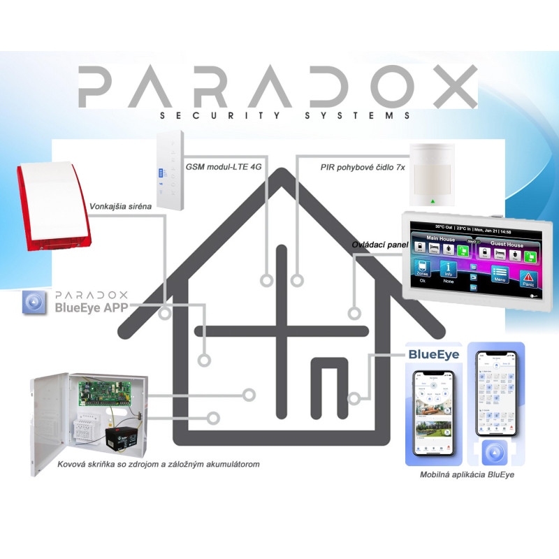 Alarm drôtový, kompletný set smart alarmu, zabezpečovací systém EZS, Paradox ( bez kabeláže!) pre objekty 7 miestnosti - (môže byť aj samoinštalačný balík, inštalácia len elektrotechnikom).