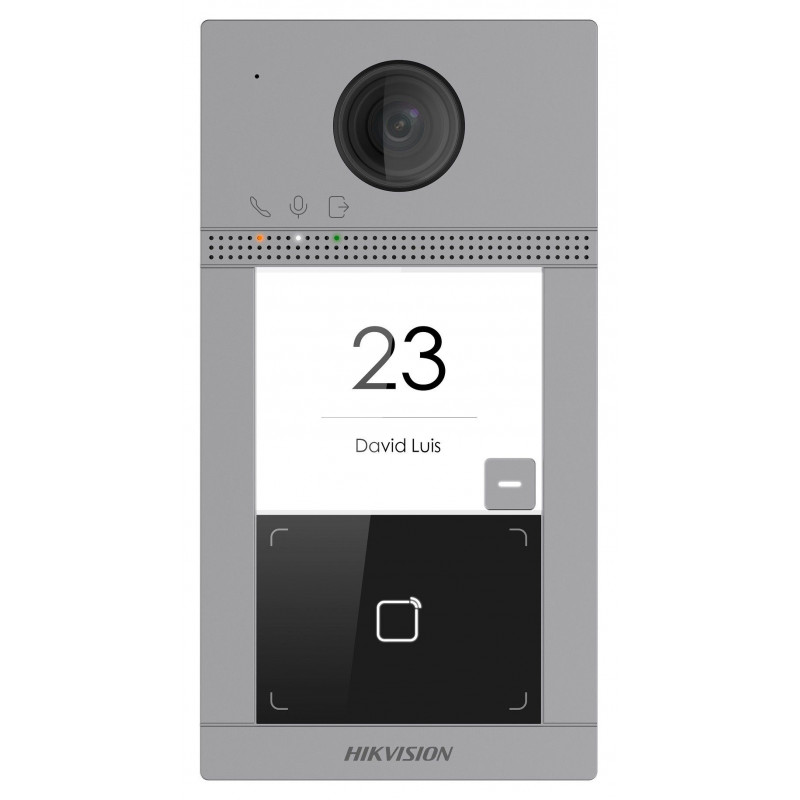 Hikvision DS-KV8113-WME1-(C)/surface, Dverný IP videopanel 2MPx, PoE, 2x výstup, Dverný IP videopanel 2. generácie v kov. prevedení s 1 tlačidlom, povrchová inštalácia, MPx kamerou s IR prisvietením a vstavanou Mifare čítačkou pre prístupové funkcie, Ethernet s PoE + WiFi. (môže byť zapojený ako samostatná dverná jednotka - kamerový modul, komunikácia cez aplikáciu HikConnect),